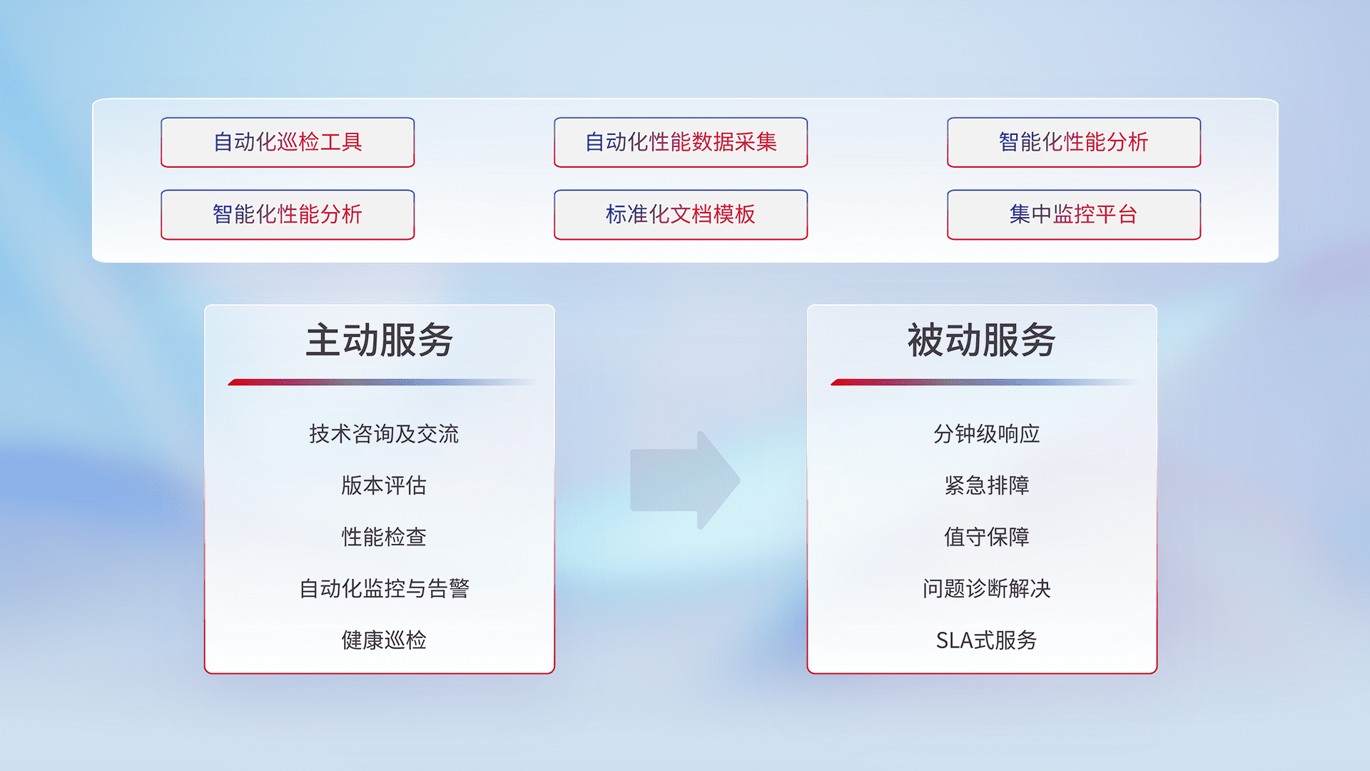 智能化工具和标准化文档,,保障服务质量,,,提供主动服务(包含技术咨询、、、、版本评估、、性能检查、、、自动化监控与告警、、、、健康巡检)和被动服务包含(分钟级响应、、、紧急排障、、、、值守保障、、问题诊断解决、、、、SLA服务)。。。。
